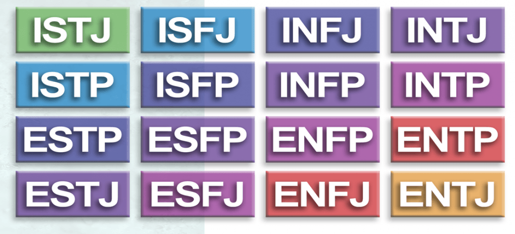 MBTI®以「能量來源、認知方式、決策依據、處事態度」分為四大向度,每個向度中有2方向、共8個傾向的排列組合進行分類。每個排列組合以一個英文字母代表。這8個英文組合起來共有16個組合,故又稱「16型人格」。